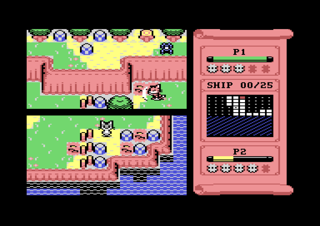 Siegfried Croes is working for the development of a good looking game, which also was presented to the public at the end of April 2023 (Maker Faire Gent). It is a multiplayer (split-screen) adventure game in which the shipwrecked cats are stranded on an island. Their mission is to go out and discover various materials needed to repair the ship.