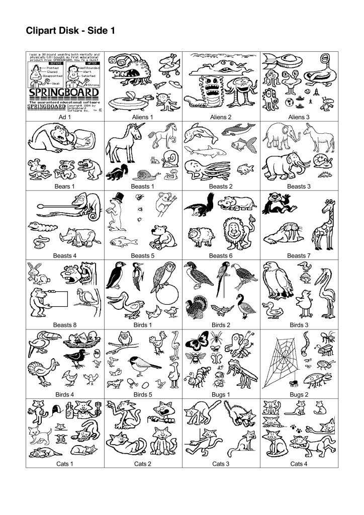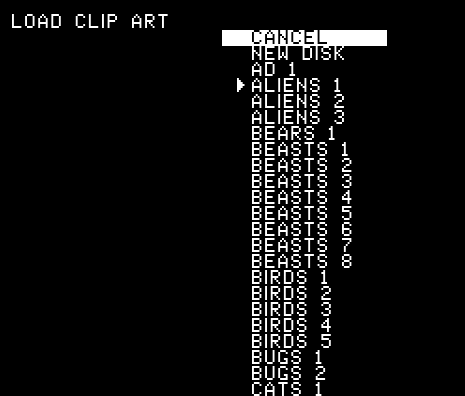 If you want to add graphics to your texts, you can choose from a good variety of a Clip Art collection on many of disk sides. Any piece of clip art can be flipped from left to rightor right to left.