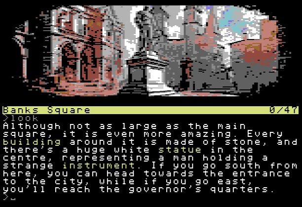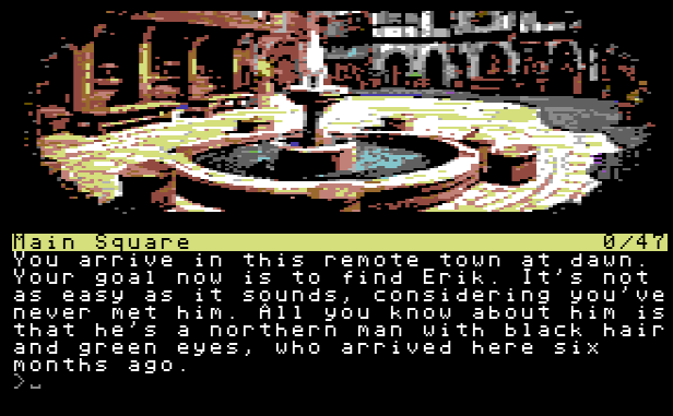 More than 30 different locations (Inn, School, Market etc.) to explore and you can save and load one game state from the disk.