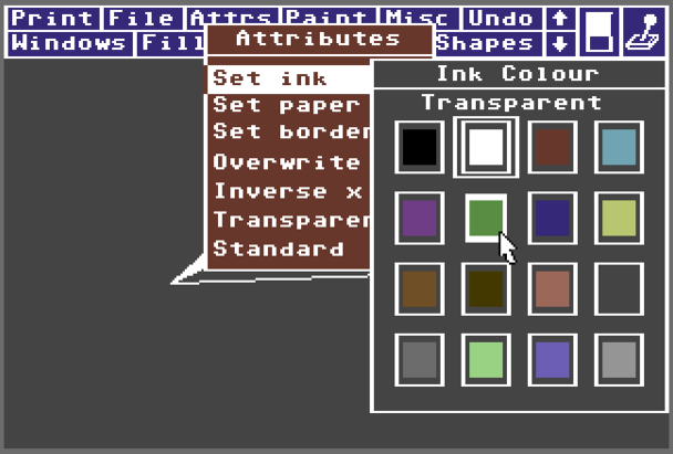 ART STUDIO is built upon the ‘windows – icons – mouse -pointing device’ concepts as pioneered by Xerox at Palo Alto and popularised by Apple with the Lisa and Macintosh computers.