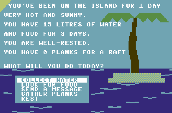You’re stuck on an island with limited supplies of water and food, and your hope is to either be picked up by a ship or to collect enough planks to build a raft yourself while trying not to die of various dangers.