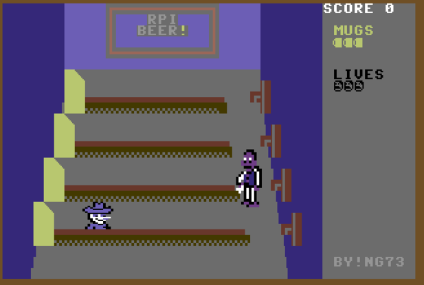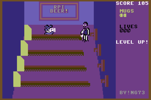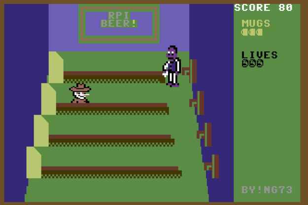 It is a simplification of the classic Tapper game: the aim is to serve all the customers in the saloon while trying not to break all the beer mugs.