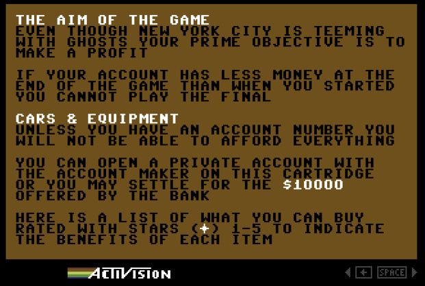 Ghostbusters is a licensed game by Activision based on the film of the same name. It was designed by David Crane and released for several home computer platforms in 1984.