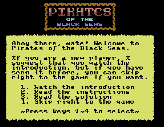 Pirates of the Black Seas is a text adventure game created with Loadstar’s Quest Writer (Published on Loadstar #77 – created by Jon Mattson).