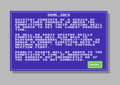 Autotest is an undeservedly forgotten gem in the Commodore 64 library, which was developed by Daisysoft and published by Byte-Back in 1990. This top-view driving game is not about speed, but precision and skill, offering a unique challenge to gamers of the time.