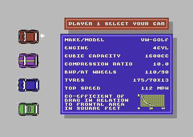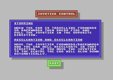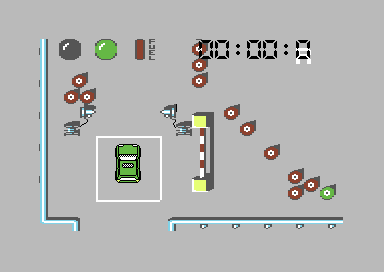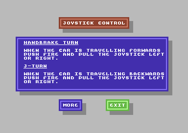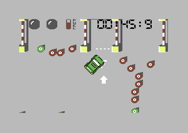 The graphics are simple but functional, adapted to the limited capabilities of the Commodore 64. In the top view, tracks and obstacles are clearly visible, making the game easier to play. The sound is basic but adequate: a pleasant background soundtrack and sound effects such as crashes or engine sounds suit the gameplay.