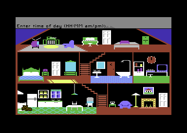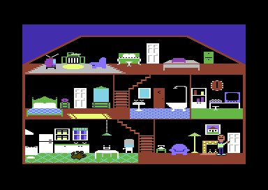 Little Computer People was an impressive technical achievement given the Commodore 64’s limitations. The game’s graphics are simple yet charming, with a colorful three-story house filled with animated objects that bring the environment to life. The black background enhances the visibility of the character and objects.