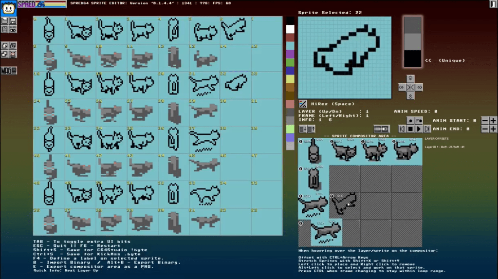 - Sprites: Designed in Spred64 and Spritepad, with Megapaint joining the pipeline soon.