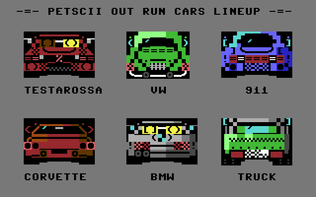 - Authentic Course Data The game includes all original OutRun routes, faithfully reconstructed within the PETSCII framework. Branching paths, shifting landscapes, and a real sense of speed are all present—despite the absence of traditional sprites or bitmaps.