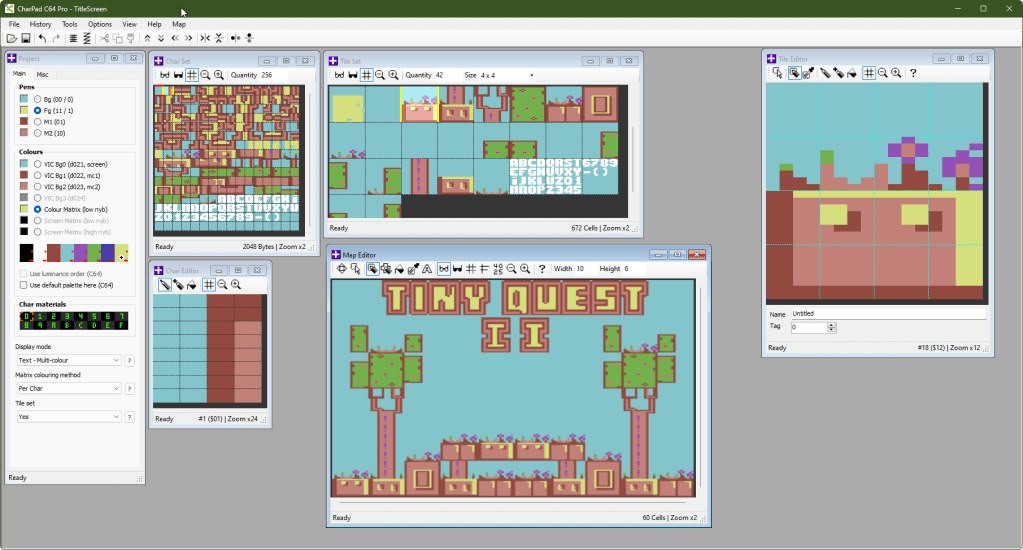 To ensure consistent performance and fast loading, the project targets a cartridge-style distribution in EasyFlash format. Visuals use a modern pixel-art language with sharp, legible UI and refined interstitial screens and animations that emphasize readability and player feedback.