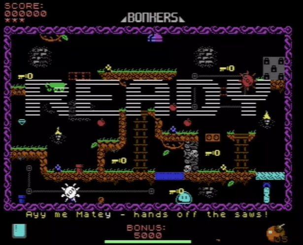 Bonkers is a platform game currently in development, created by Ole Mogensen for the Commodore 64. Designed in the tradition of flick-screen games, it consists of 20 interconnected screens filled with dangers, puzzles, and strange mechanisms. Although still in development, the game already shows strong creative vision and technical finesse.