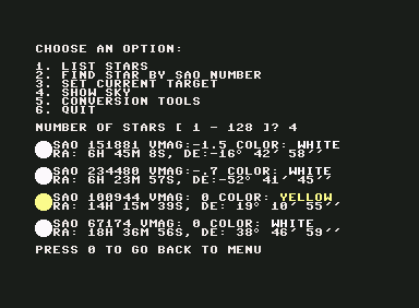 The Astronomy Program Sky View is an application developed few years ago by a talented spanish coder for the Commodore 64 that enables database-driven display and analysis of stars. The goal of the project is to exploit the technical capabilities of the platform in a scientific visualization environment.