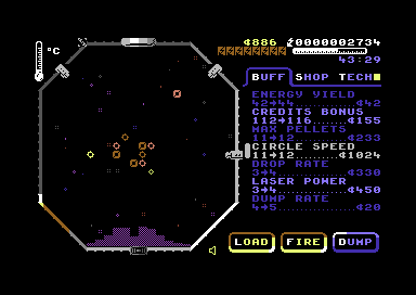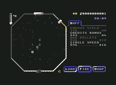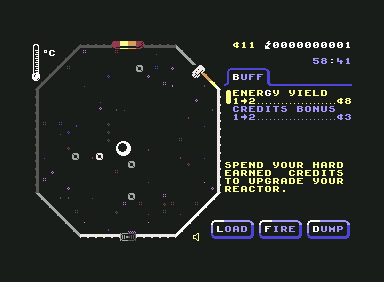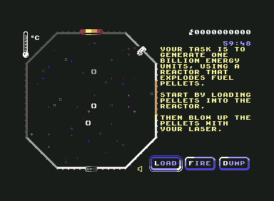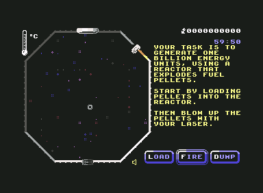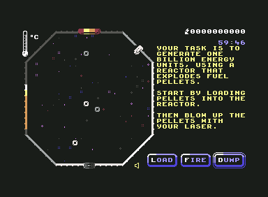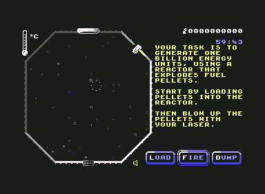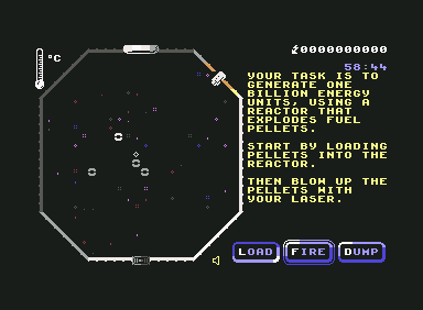 The player controls a reactor that blows up fuel pellets to generate energy. The goal is to generate one billion energy units in a limited time frame.