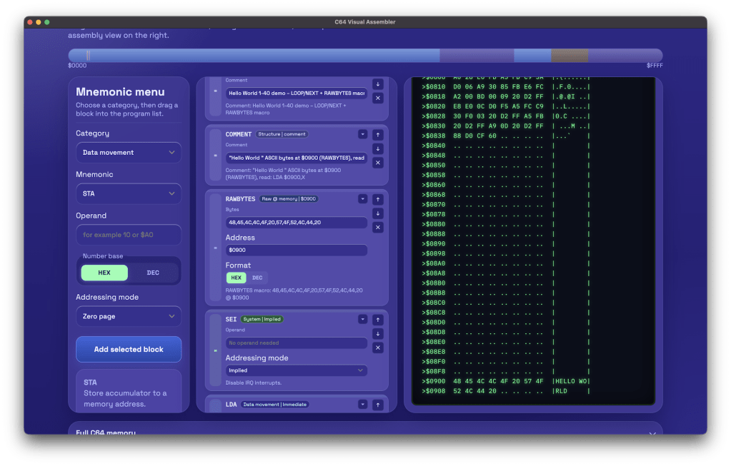 C64 Visual Assembler is a desktop application that lets you write Commodore 64 machine code programs visually – no text editor required.