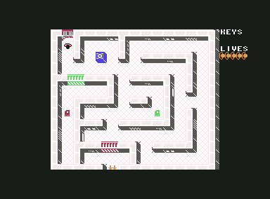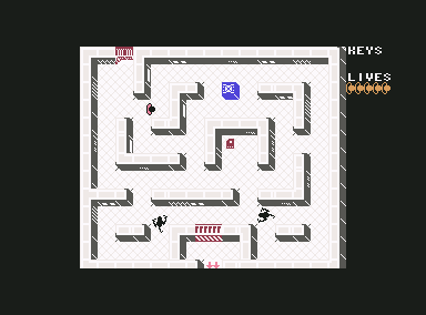 The goal of the game is to escape from the aliens and make it to the exit door (marked by two red arrows pointing down). To do this, you need to collect keycards (red and green) so you can open the doors of the corresponding colors. The aliens are faster than the player, and if they sense or see you (even through walls), they immediately rush toward you and attack.