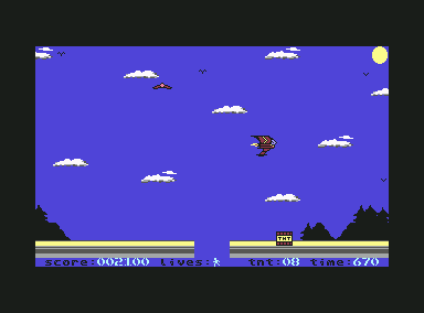 In the game, you must complete tasks at various locations by controlling a spacecraft. First, you must use rockets to destroy the enemies moving back and forth, and then use a magnetic hook to pick up a TNT package and deliver it to the correct locations.